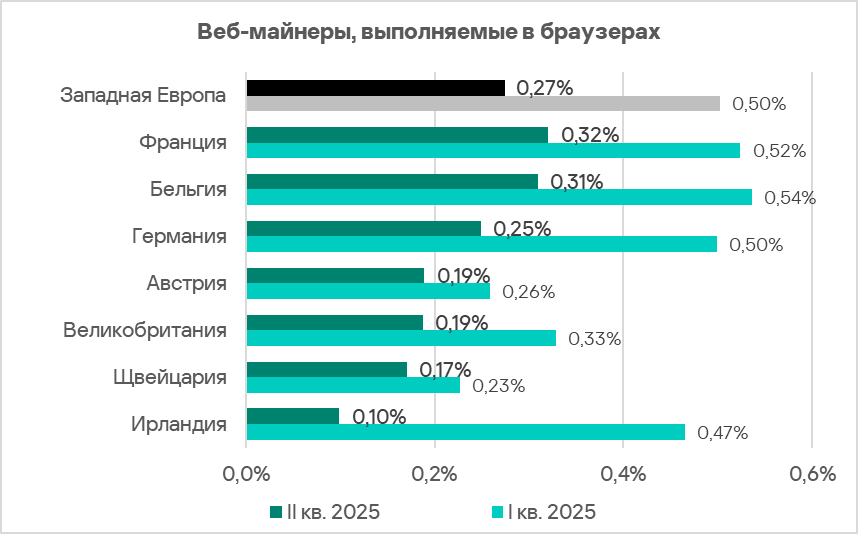 Среди стран региона в рейтинге по доле компьютеров АСУ, на которых блокируются веб-майнеры, лидирует Франция с 0,32%.