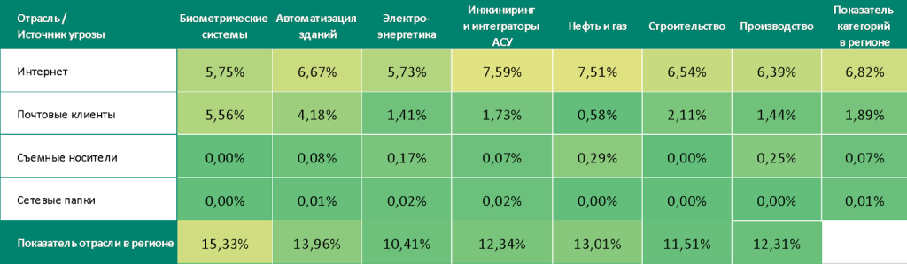 Высокие показатели угроз, распространяющихся через почтовые клиенты (фишинг), и шпионского ПО — признак высокой доступности технологических систем в регионе для продвинутых категорий злоумышленников.