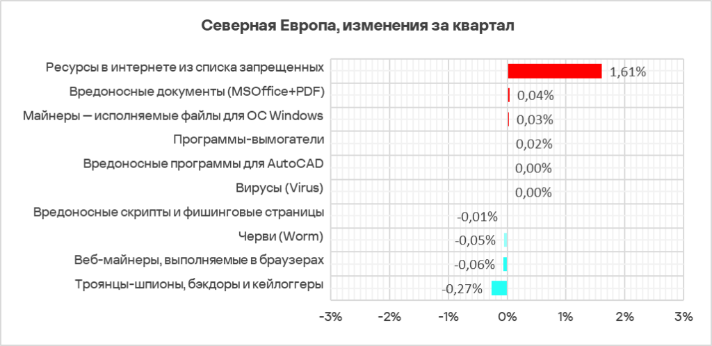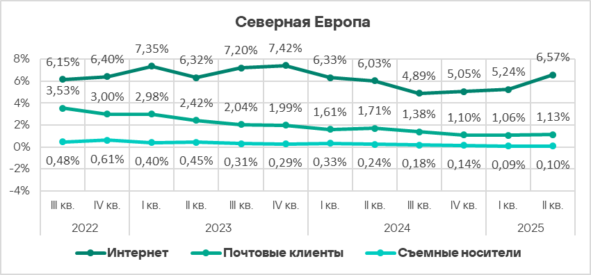 В Северной Европе во втором квартале 2025 года выросли показатели нескольких категорий угроз, наиболее значительный рост отмечен у следующих категорий: