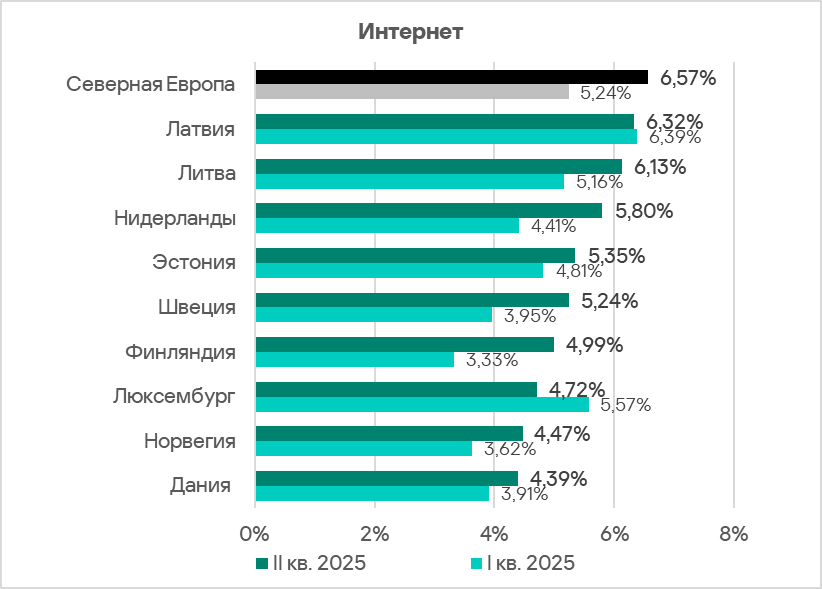 По доле компьютеров АСУ, на которых были заблокированы угрозы из интернета, Северная Европа занимает 13-е место в рейтинге регионов с показателем 6,57%. Этот показатель растет в регионе третий квартал подряд. Во втором квартале 2025 года по его росту Северная Европа заняла первое место.