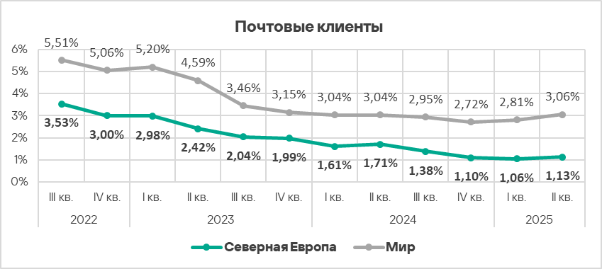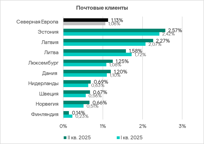 По доле компьютеров АСУ, на которых были заблокированы угрозы в почтовых клиентах, во втором квартале 2025 года Северная Европа занимает 13-е место в рейтинге регионов с 1,13%. Этот показатель в 1,4 раза больше, чем в России, которая замыкает этот рейтинг.