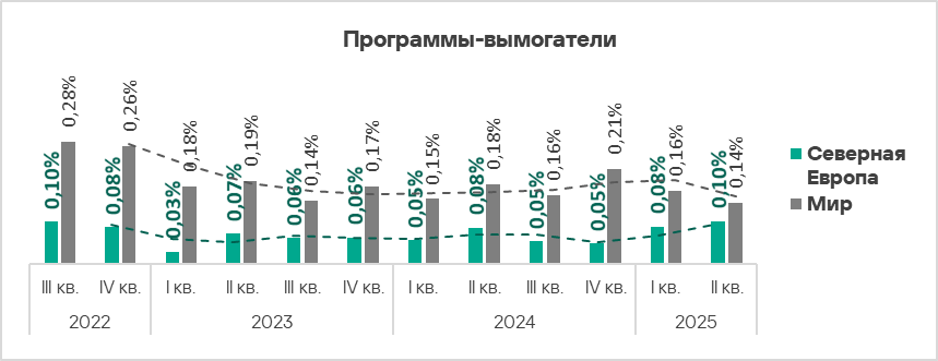 Доля компьютеров АСУ, на которых блокируются программы-вымогатели, в регионе растет второй квартал подряд. Во втором квартале 2025 года Северная Европа занимает третье место среди регионов по его росту.
