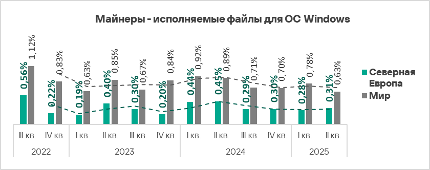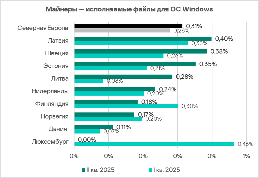 По доле компьютеров АСУ, на которых блокируются майнеры — исполняемые файлы для ОС Windows, Северная Европа находится на 11-м месте в соответствующем рейтинге с 0,31%. Этот показатель в 1,7 раза больше, чем в Восточной Азии, где значение минимальное среди регионов.