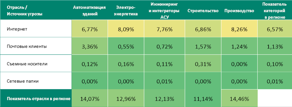 При оценке проблем отраслей мы используем тепловые карты. На таких картах ячейки окрашиваются в цвета в диапазоне от красного к зеленому, где красный цвет указывает на максимальное значение для индустрии в регионе, источника или категории угроз среди всех регионов и индустрий. В Восточной Европе значения, наиболее приближенные к максимальным, наблюдаются для совокупного показателя в сфере автоматизации зданий, а также в категории ресурсы в интернете из списка запрещенных в строительной отрасли.