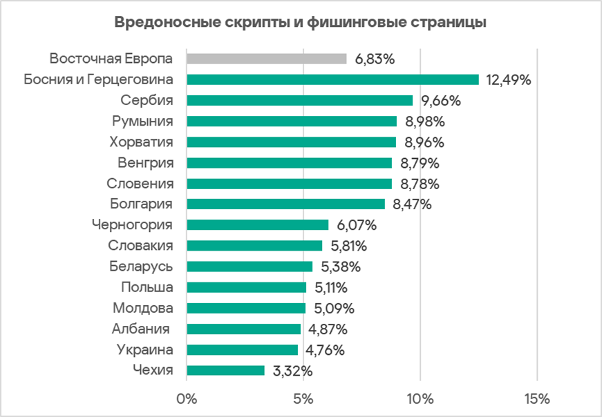 По доле компьютеров АСУ, на которых блокируются вредоносные скрипты и фишинговые страницы, Восточная Европа занимает седьмое место в соответствующем рейтинге регионов с 6,83%. Это в 2,2 раза больше, чем в Северной Европе, где этот показатель наименьший.