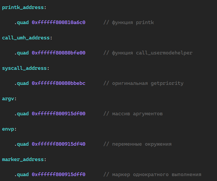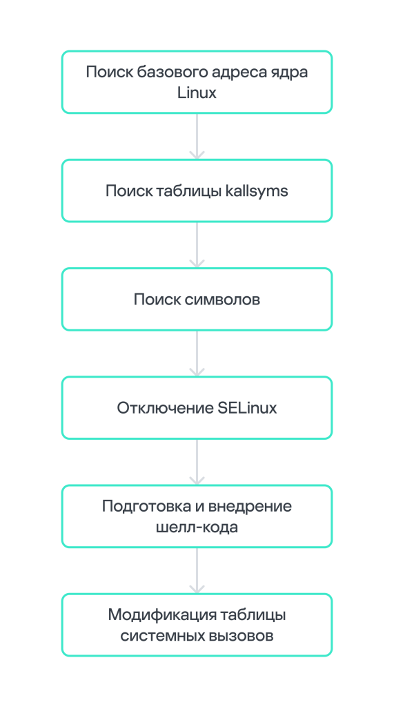 После обнаружения базового адреса ядра необходимо найти таблицу символов ядра (kallsyms). Эта таблица содержит адреса всех экспортируемых функций и переменных ядра, что позволяет обнаружить адреса требуемых для проведения атаки объектов.