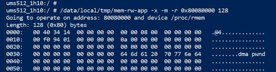 Остается лишь проверить достоверность гипотезы. Для этого нужно снова пропатчить таблицу MPU, на это раз добавив запись, которая разрешает доступ на чтение и запись к памяти, начиная с адреса 0х80000000. В результате нам удается замапить адресное пространство АР в адресное пространство СР. В качестве доказательства концепции мы патчим первую страницу ядра Linux.