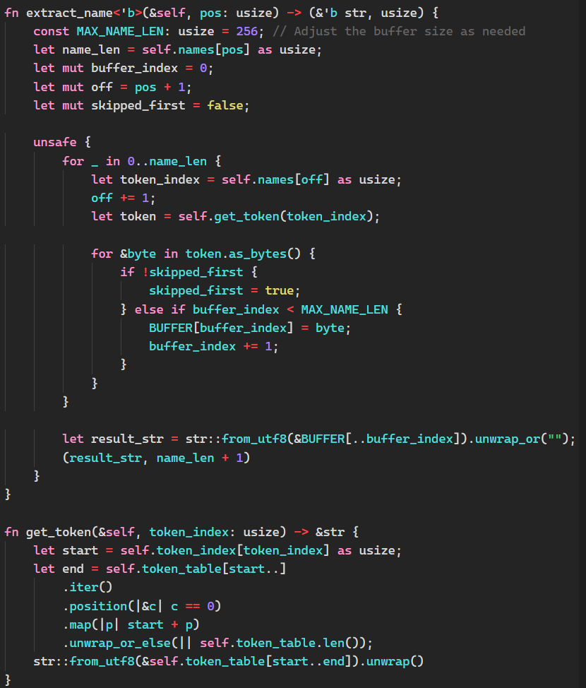 При этом массив адресов символов может использовать относительную адресацию вместо абсолютной для экономии памяти на 64-битных системах, а строки с именами символов могут быть дополнительно сжаты. В нашем случае оба этих механизма (относительная адресация и сжатие имен символов) были использованы, что затрудняло поиск таблицы в памяти ядра. Тем не менее, таблицу удалось найти с использованием эвристического алгоритма, который «собирает» ее по данным, которые считает правильными, и проверяет целостность после сборки.