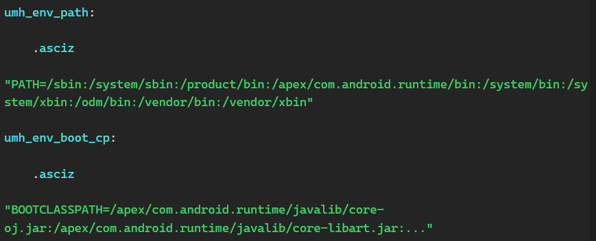 В коде также содержится таблица переменных окружения, необходимых для корректного функционирования пользовательских процессов am (Activity Manager), pm (Package Manager) и других.