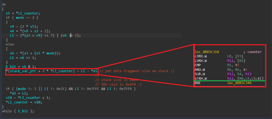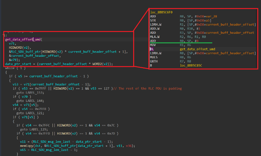 При обработке принятого SDU-пакета происходит разбор полей его заголовка. Сам пакет состоит из обязательного заголовка, необязательных заголовков и данных. Обработка необязательного заголовка заключается в последовательном проходе по каждому полю. Для этого используется функция get_data_offset. Она разбирает необязательные заголовки, собирает размеры фрагментов данных внутри части данных и возвращает указатель на данные внутри SDU-пакета. Важно: информация о размере всех конкатенированных PDU внутри SDU, согласно анализу кода операционной системы модема, хранится на стеке!