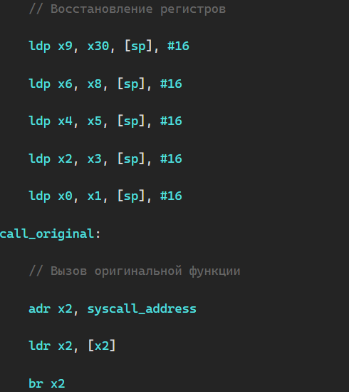 В конце работы шелл-код восстанавливает состояние регистров процессора и вызывает оригинальный системный вызов getpriority.