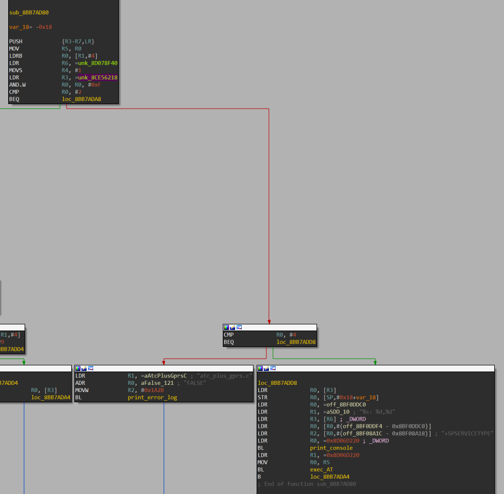 Чтобы убедиться в том, что мы действительно можем исполнить свой код на стороне модема, воспользуемся доступным обработчиком АТ-команд. Поскольку нам неизвестен текущий адрес фрейма стека, на котором лежат наши данные, неизвестно, исполняем ли стек вообще, и мы не уверены, доступны ли секции кода для записи (хотя догадываемся, что нет), то самый надежный способ – переписать данные в области RAM-памяти. Для этого ищем подходящую функцию среди доступных АТ-команд. Первая подходящая команда – SPSERVICETYPE.