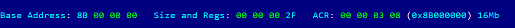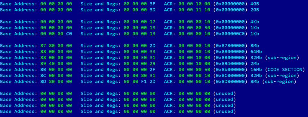 Далее, по аналогии, мы вводим адрес фрейма стека, на котором находятся наши данные. Однако, к сожалению, оказывается, что стек не является исполняемым. Теперь перед нами стоит задача разобраться с настройкой MPU на модеме. Для этого, снова используя метод ROP-цепочек, генерируем код, который будет читать таблицу MPU по DWORD за раз. Спустя множество итераций мы получаем следующую таблицу.