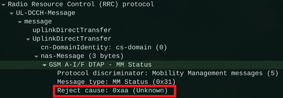 В итоге нам удается не только получить возможность исполнения своего кода на стороне модема, но и установить с ним полноценную двухстороннюю связь, используя высокоуровневый протокол NAS в качестве способа доставки сообщений. В данном случае это пакет MM Status с полем cause, равным 0хАА.