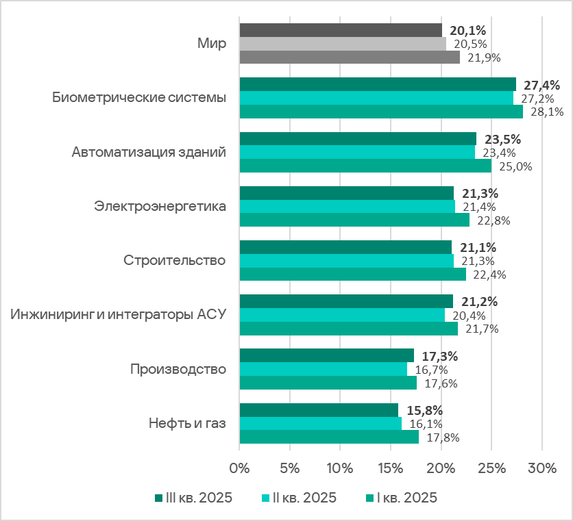 В третьем квартале 2025 года рейтинг исследуемых отраслей и типов ОT-инфраструктур по доле компьютеров АСУ, на которых были заблокированы вредоносные объекты, традиционно возглавили биометрические системы.