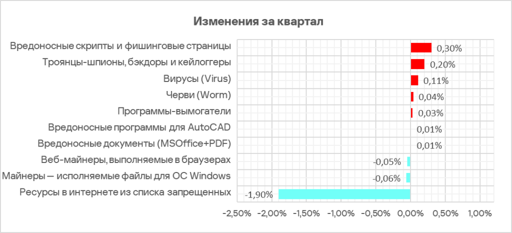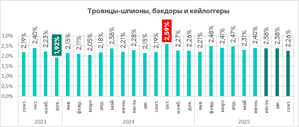 Вредоносные скрипты и фишинговые страницы преимущественно распространяются через интернет и фишинговые письма, но также встречается и на следующих этапах атаки — для закрепления в системе, сбора данных и взаимодействия с серверами управления. Эта категория угроз в третьем квартале 2025 года лидирует по росту показателя (+0,3 п. п.). Шпионские программы на втором месте в этом рейтинге (+0,2 п. п.).