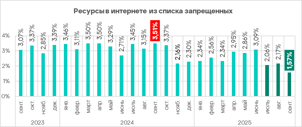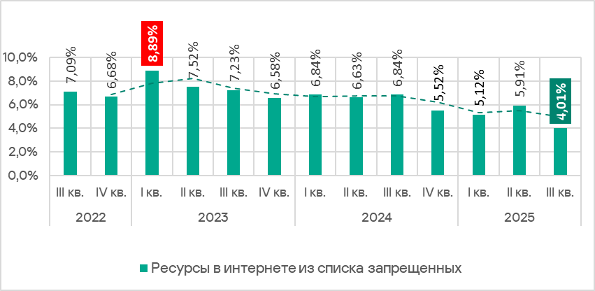 В третьем квартале 2025 года после роста в предыдущем квартале доля компьютеров АСУ, на которых были заблокированы ресурсы в интернете из списка запрещенных, заметно уменьшилась (на 1,9 п. п.) до минимального с 2022 года значения 4,01%.