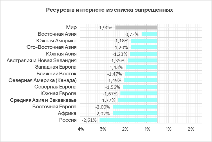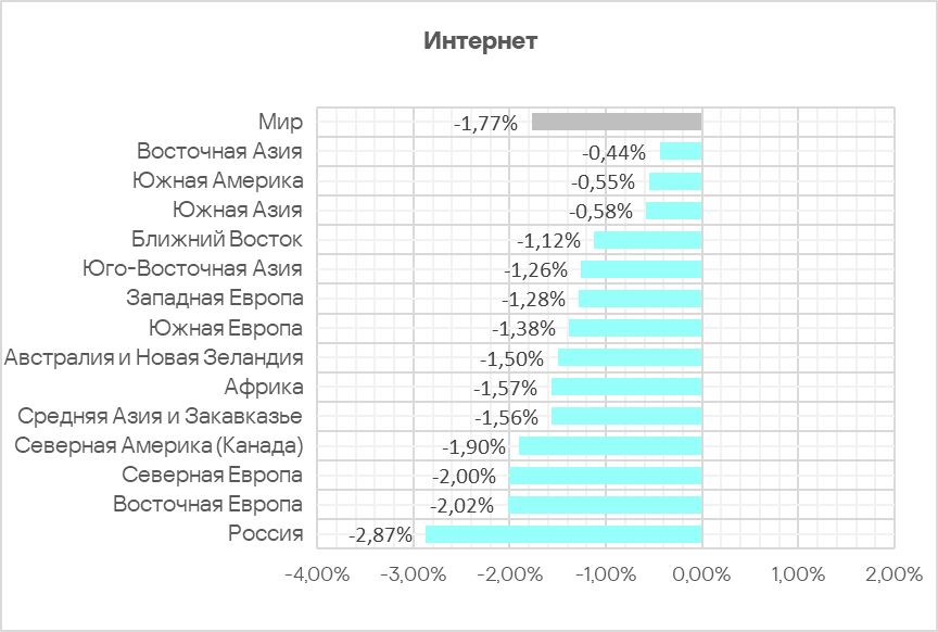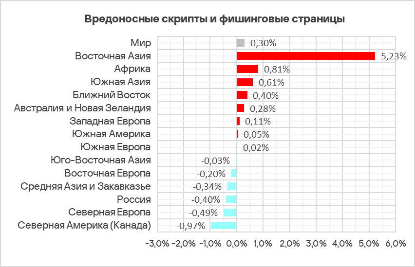 Несмотря на уменьшение среднемирового показателя угроз из интернета, он более чем в 2,6 раза превышает показатель угроз из почтовых клиентов. Однако в некоторых регионах эта разница не столь значительна, например в Южной Европе значения сопоставимы — 6,97% и 6,85% соответственно. Этот регион лидирует по доле компьютеров АСУ, на которых были заблокированы угрозы из почтовых клиентов.