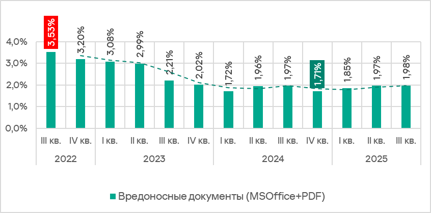 В третьем квартале 2025 года доля компьютеров АСУ, на которых были заблокированы такие угрозы, немного уменьшилась — до 3,01%.