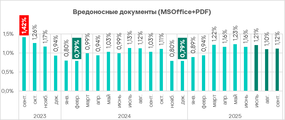 В течение третьего квартала 2025 года самой высокой доля компьютеров АСУ, на которых были заблокированы вредоносные объекты, была в августе. В сентябре месячный показатель был наименьшим за два года.