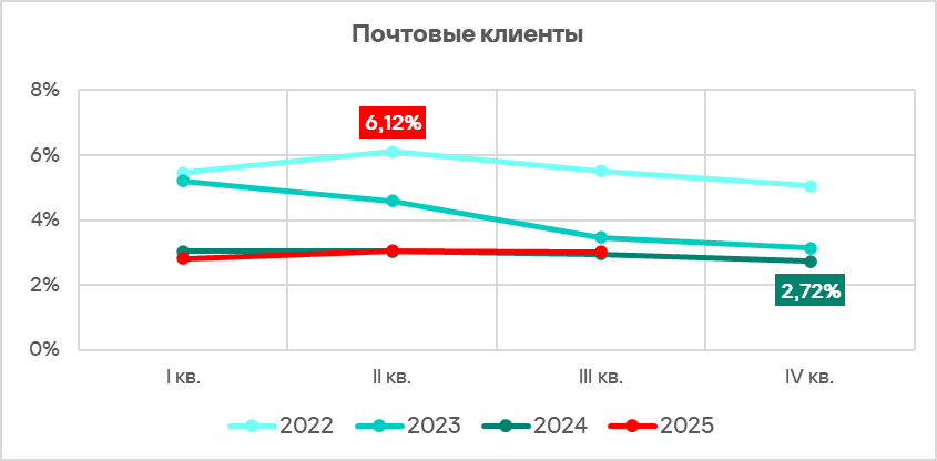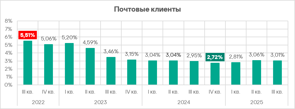 В третьем квартале 2025 показатель угроз из почтовых клиентов увеличился в пяти регионах, больше всего — в Австралии и Новой Зеландии.