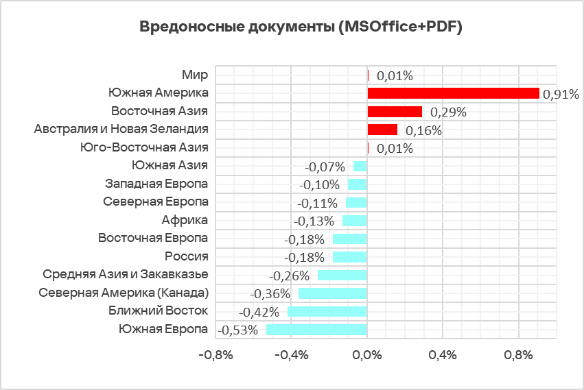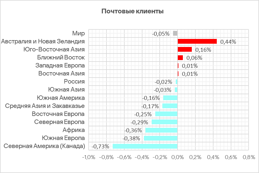 Состав топ 3 регионов по уровню угроз из почтовых клиентов не изменился. В него вошли: Южная Европа, Ближний Восток и Южная Америка.