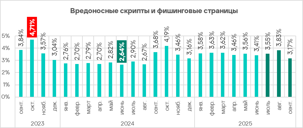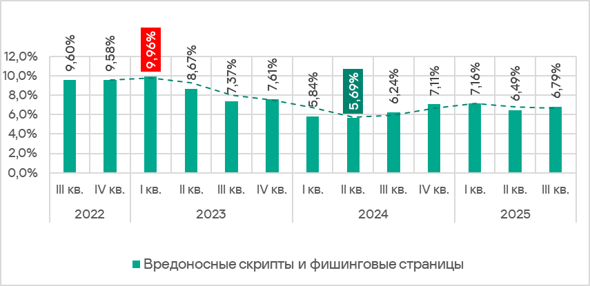 В третьем квартале 2025 года категория вредоносных скриптов и фишинговых страниц лидирует среди остальных категорий угроз и по доле компьютеров АСУ, на которых была заблокирована угроза, и по росту показателя.