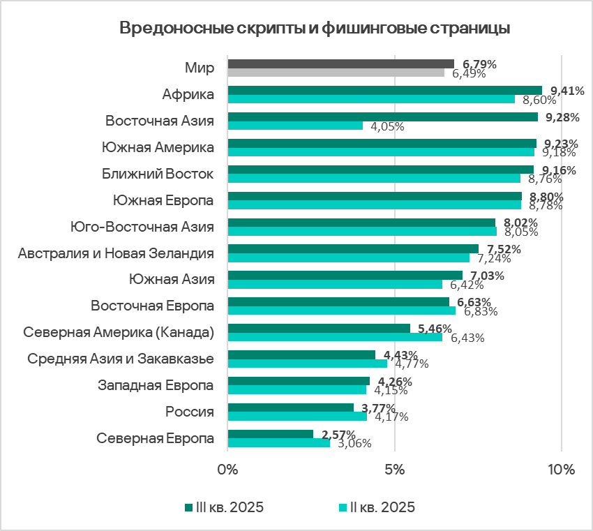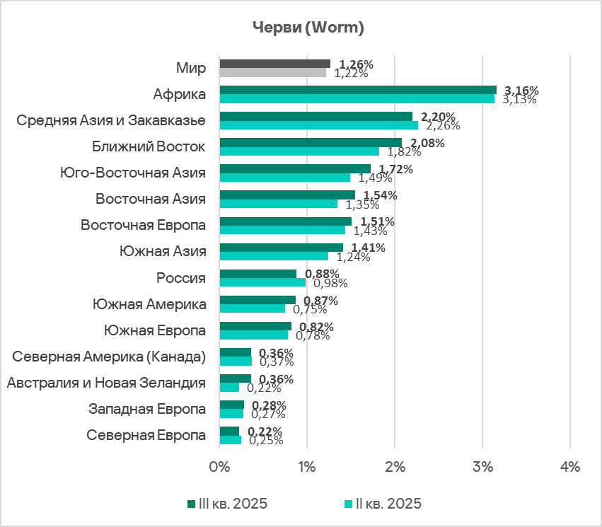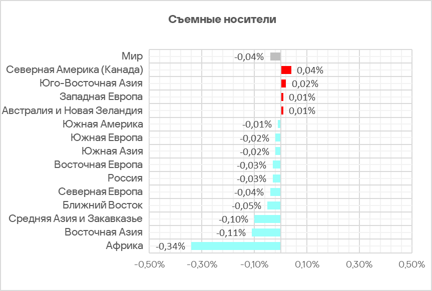 В третьем квартале 2025 показатель угроз со съемных носителей уменьшился во всех регионах, кроме Северной Америки (Канада), Юго-Восточной Азии, Западной Европы и Австралии и Новой Зеландии.