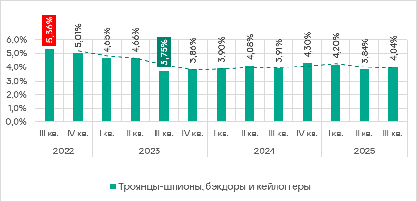 В третьем квартале 2025 года доля компьютеров АСУ, на которых было заблокировано шпионское ПО, увеличилась до 4,04%. Это не самый высокий показатель за исследуемый период, однако с ним шпионские программы впервые заняли второе место в рейтинге категорий по доле атакованных компьютеров.