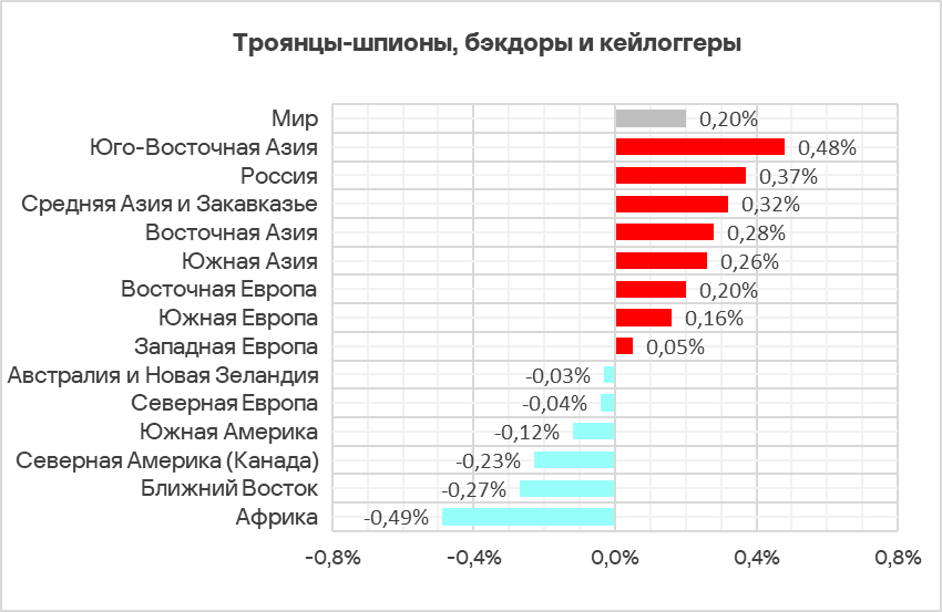 В регионах доля компьютеров АСУ, на которых было заблокировано шпионское ПО, варьирует от 1,40% в Северной Европе до 6,33% в Африке. В топ 3 регионов по этому показателю, как и в прошлом квартале, вошли Африка, Юго-Восточная Азия и Южная Европа.