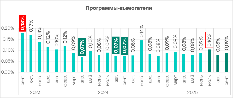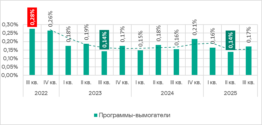 В третьем квартале 2025 года доля компьютеров АСУ, на которых были заблокированы программы-вымогатели, подросла до 0,17%, это чуть выше значения первого квартала года.