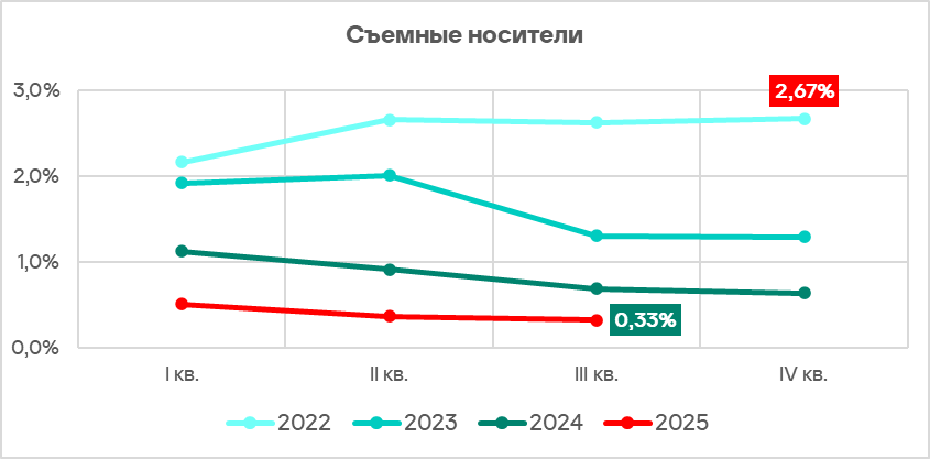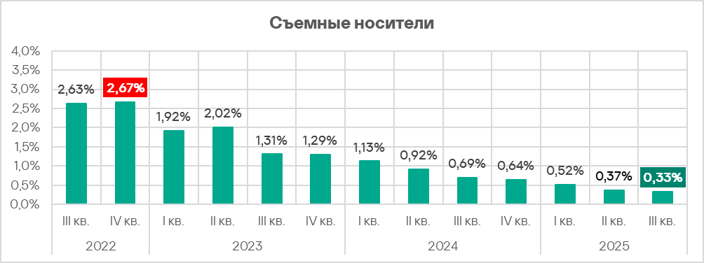 Доля компьютеров АСУ, на которых угрозы были заблокированы при подключении съемных носителей, в третьем квартале 2025 года была минимальной с начала 2022 года — 0,33%.
