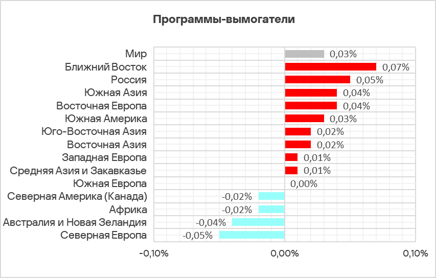 В регионах доля компьютеров АСУ, на которых были заблокированы программы-вымогатели, варьирует от 0,05% в Северной Европе до 0,33% на Ближнем Востоке, который вернулся на позицию лидера в этом рейтинге. В топ 3 регионов также входят Африка и Южная Азия.