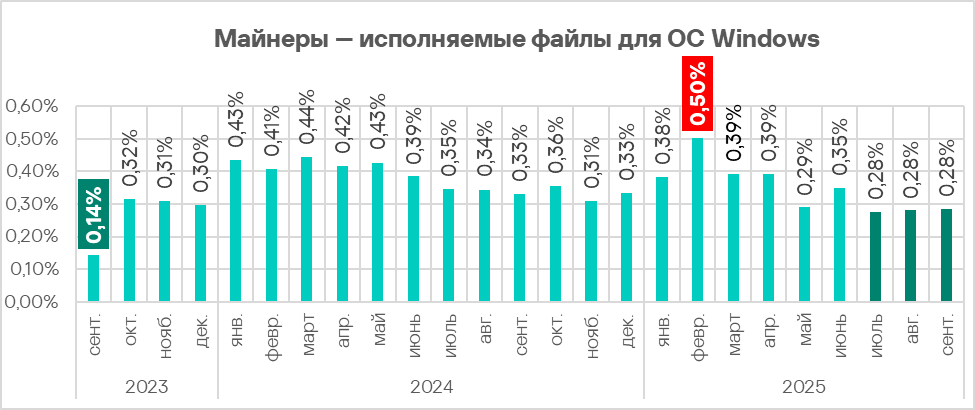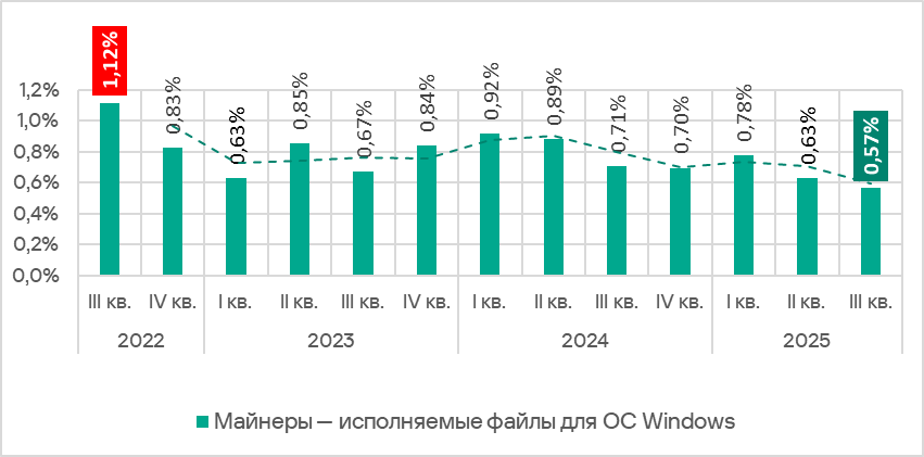 В третьем квартале 2025 года доля компьютеров АСУ, на которых были выявлены майнеры в формате исполняемых файлов для Windows, уменьшилась до 0,57%. Это наименьший квартальный показатель за последние три года.