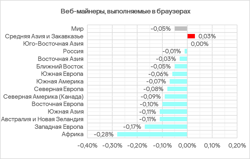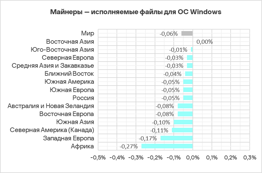 В регионах доля компьютеров АСУ, на которых были заблокированы майнеры — исполняемые файлы для ОС Windows, варьирует от 0,13% в Австралии и Новой Зеландии до 1,17% в Средней Азии и Закавказье. В тройку лидеров по этому показателю, кроме Средней Азии и Закавказья, входят Россия и Восточная Европа.