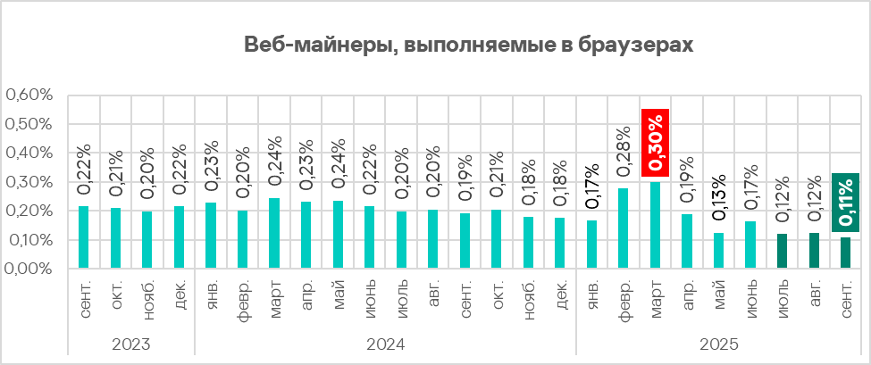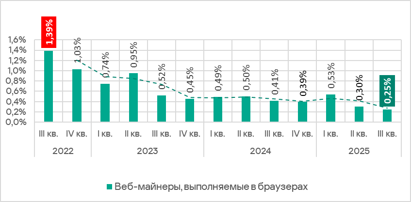 Доля компьютеров АСУ, на которых были заблокированы веб-майнеры, в третьем квартале 2025 года уменьшилась до 0,25%. Это минимальное значение за период с третьего квартала 2022 года.