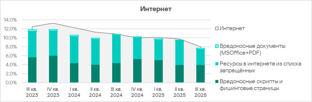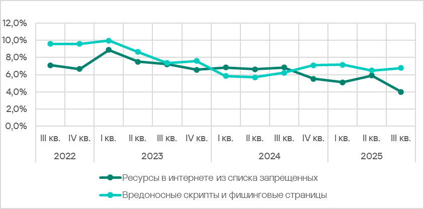Основные категории угроз из интернета*, которые были заблокированы на компьютерах АСУ в третьем квартале 2025 года, — это вредоносные скрипты и фишинговые страницы, а также ресурсы в интернете из списка запрещенных.