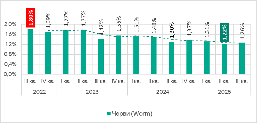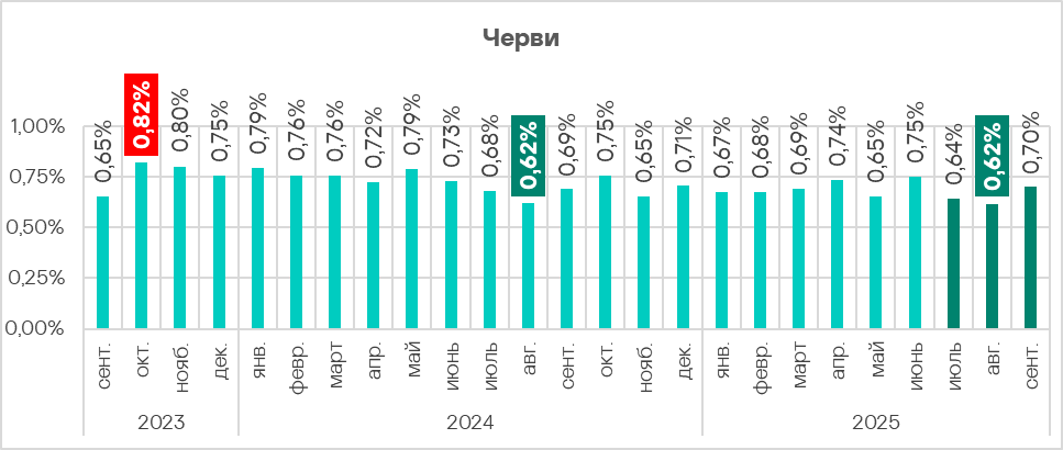 Доля компьютеров АСУ, на которых были заблокированы черви, в третьем квартале 2025 года после минимума предыдущего квартала увеличилась до 1,26%.