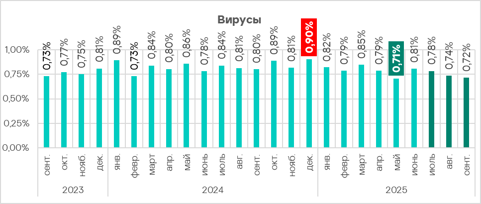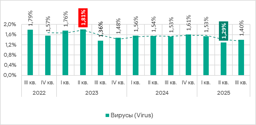 Доля компьютеров АСУ, на которых были заблокированы вирусы, в третьем квартале 2025 года после минимума предыдущего квартала увеличилась до 1,40%.