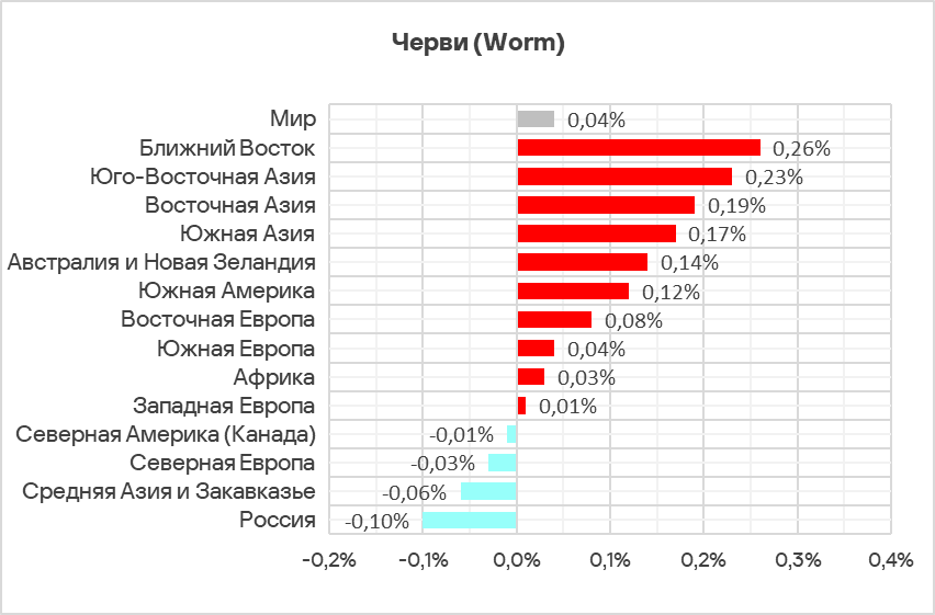 В регионах доля компьютеров АСУ, на которых были заблокированы черви, варьирует от 0,22% в Северной Европе до 3,16% в Африке. Топ 3 регионов по этому показателю неизменен: Африка, Средняя Азия и Закавказье, Ближний Восток.