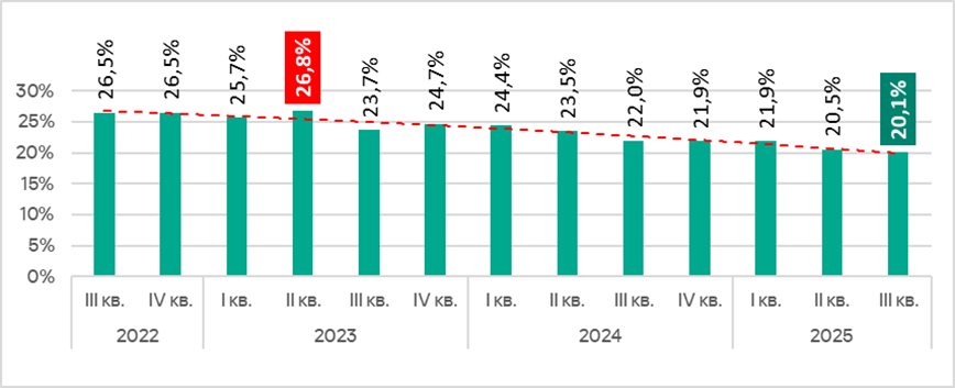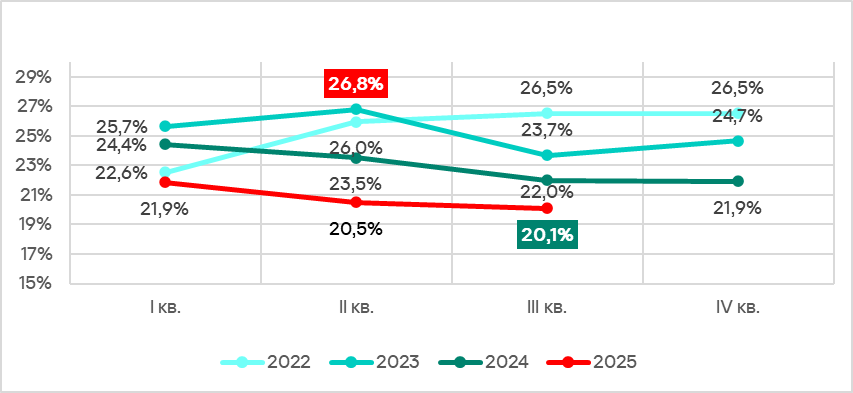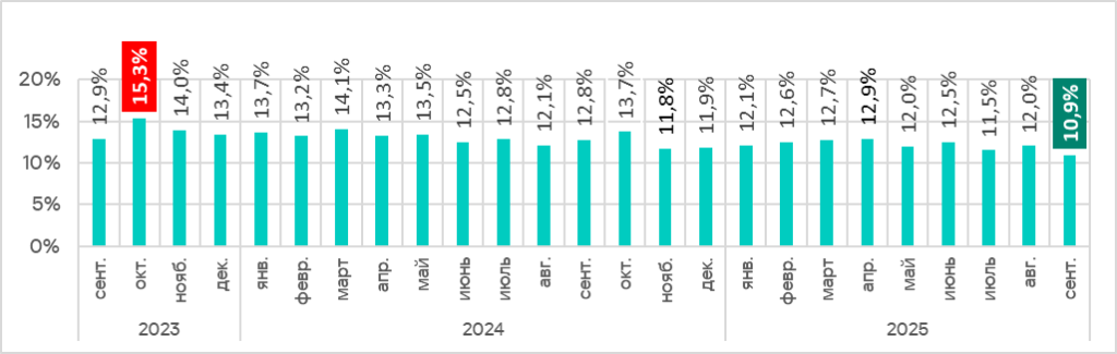 В сентябре 2025 года был отмечен минимальный месячный показатель с января 2022 года.