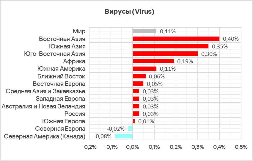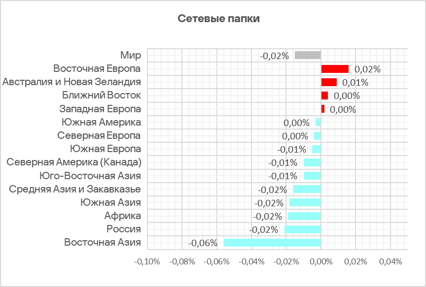 В регионах доля компьютеров АСУ, на которых угрозы были заблокированы в сетевых папках, варьирует от 0,006% в Северной Европе до 0,20% в Восточной Азии.