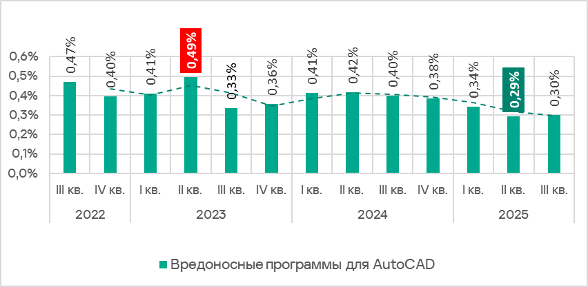 В третьем квартале 2025 года доля компьютеров АСУ, на которых было заблокировано вредоносное ПО для AutoCAD, после минимума предыдущего квартала подросла до 0,30%.