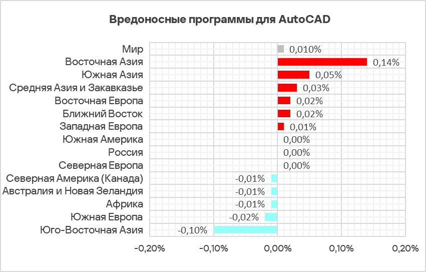 В регионах доля компьютеров АСУ, на которых были заблокированы вредоносные программы для AutoCAD, варьирует от 0,01% в Северной Америке (Канада) до 2,20% в Юго-Восточной Азии. Лидируют по этому показателю те же регионы, что и в рейтинге по вирусам: Юго-Восточная Азия, Восточная Азия (оба региона с отрывом от остальных) и Африка.