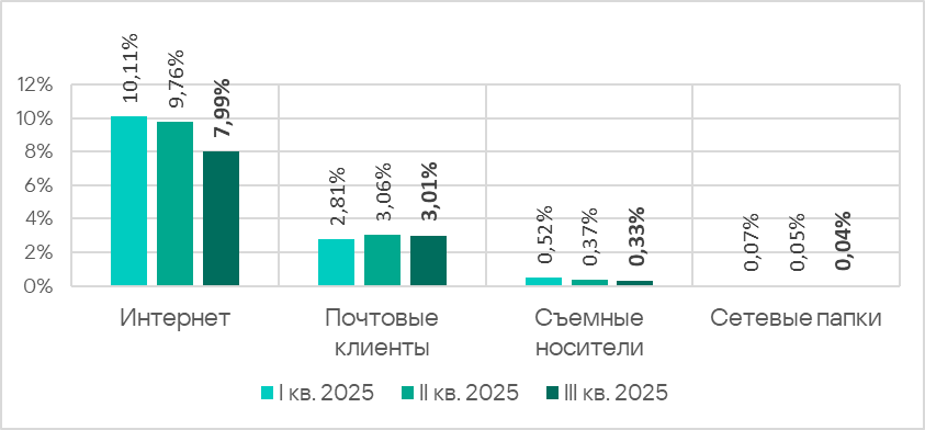 Основными источниками угроз для компьютеров в технологической инфраструктуре организаций по-прежнему остаются интернет, почтовые клиенты и съемные носители. В третьем квартале 2025 года показатели всех источников угроз в среднем по миру уменьшились. Доля компьютеров АСУ, на которых были заблокированы угрозы из интернета, была минимальной с 2022 года.