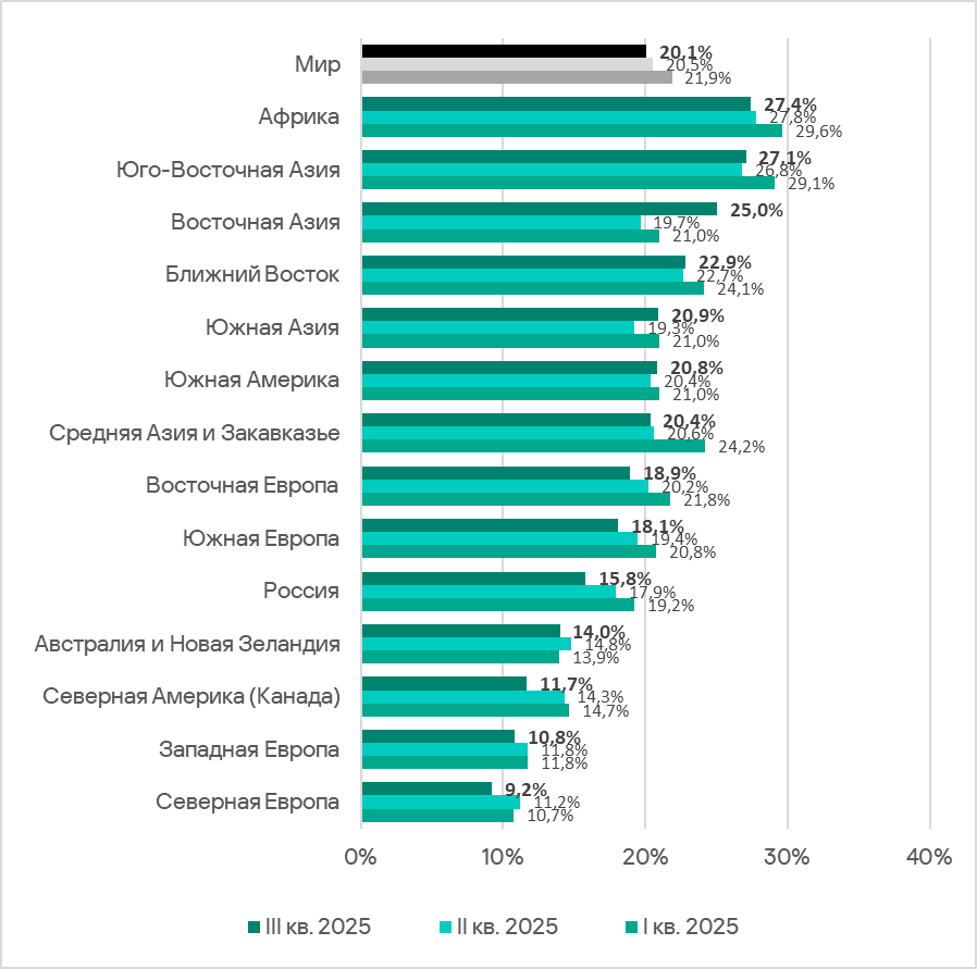 В регионах доля компьютеров АСУ, на которых в третьем квартале 2025 года были заблокированы вредоносные объекты, варьирует от 9,2% в Северной Европе до 27,4% в Африке.