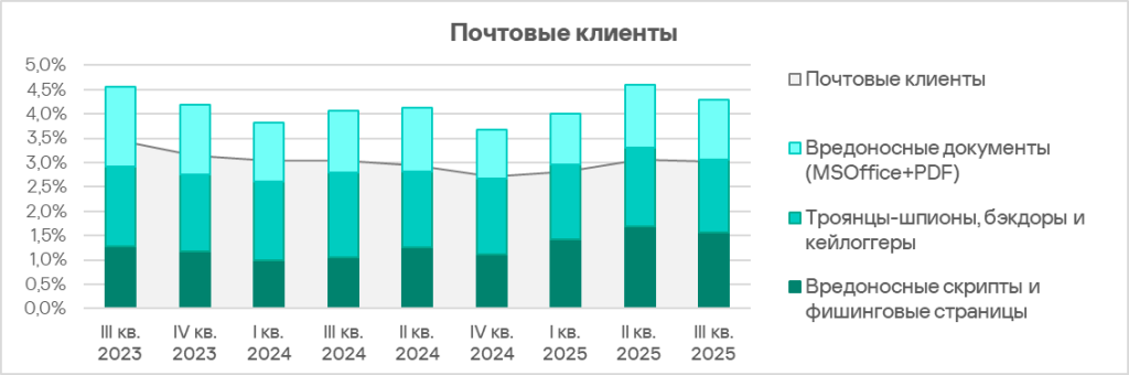 Основные категории угроз из почтовых клиентов: вредоносные скрипты и фишинговые страницы, шпионское ПО и вредоносные документы.