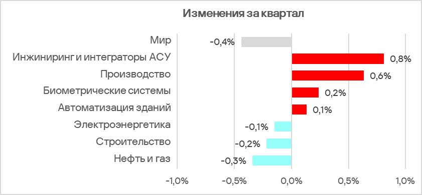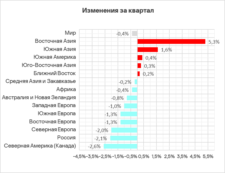 Показатель за квартал увеличился в пяти регионах, больше всего — в Восточной Азии, где был отмечен резкий рост доли компьютеров АСУ, связанный с локальным распространением вредоносных скриптов в OT-инфраструктуре организаций в сфере инжиниринга и интеграции АСУ.