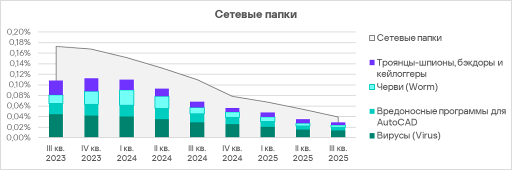 Основными категориями угроз, которые распространялись через сетевые папки в третьем квартале 2025 года, были вирусы, вредоносное ПО для AutoCAD, черви и шпионское ПО.