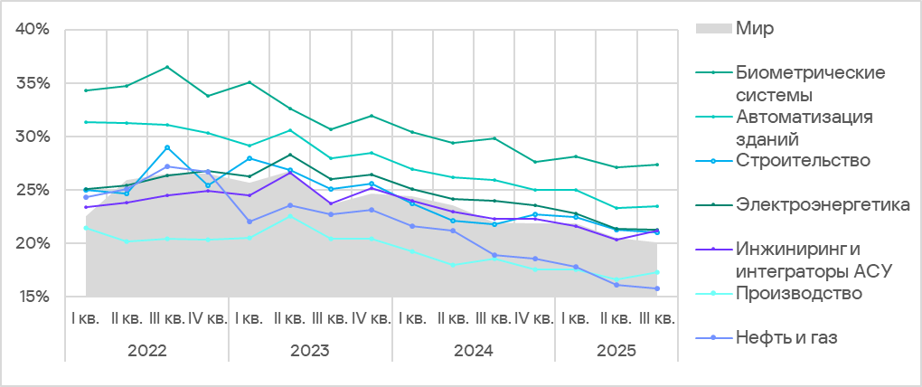 В третьем квартале 2025 года в мире доля компьютеров АСУ, на которых были заблокированы вредоносные объекты, продолжила уменьшаться и оказалась минимальной с 2022 года — 20,1%.